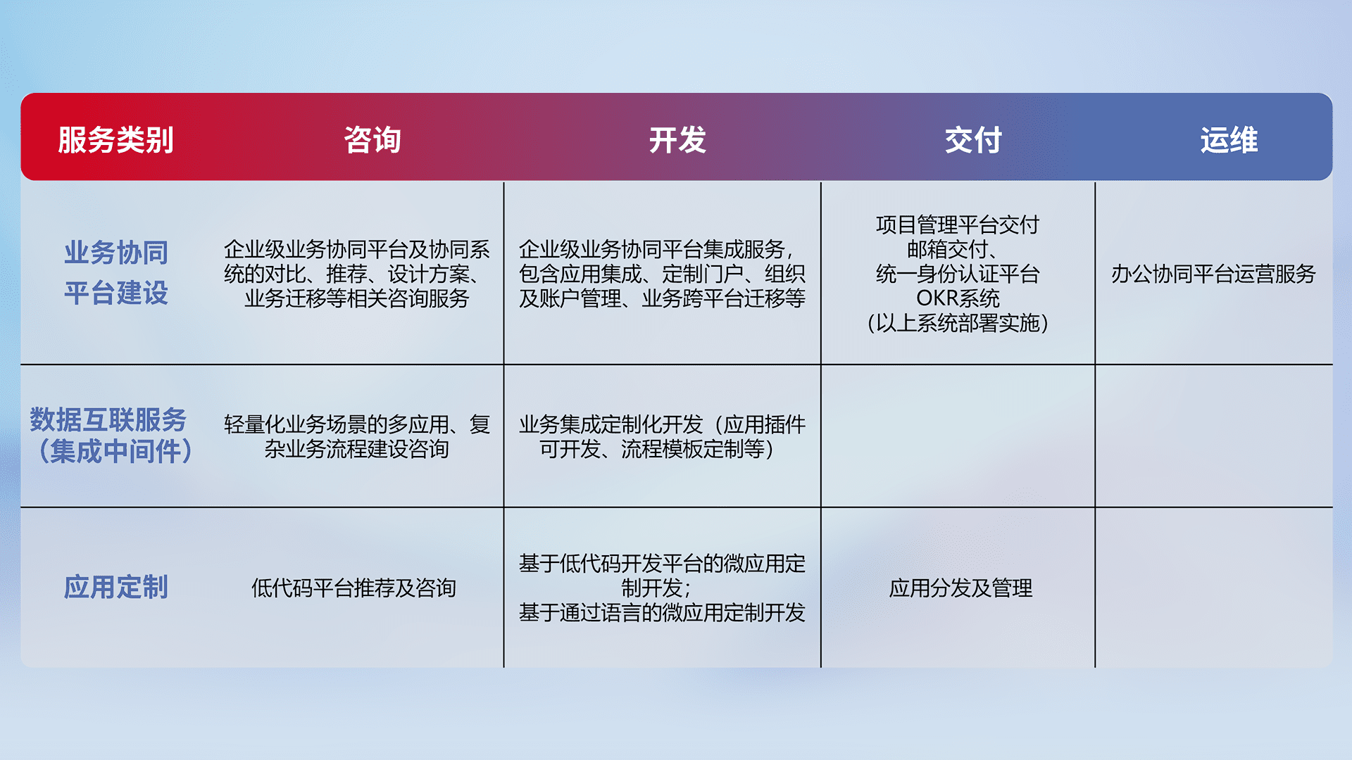 针对钉钉、、、企微、、、、IDaas等平台级产品提供产品的规划、、方案、、、、交付、、定制化开发等服务,,,,实现如统一协同办公、、、智能客户服务、、混合会议管理、、、、智能数据查询、、、、等业务场景,,,,实现数字化转型。。。