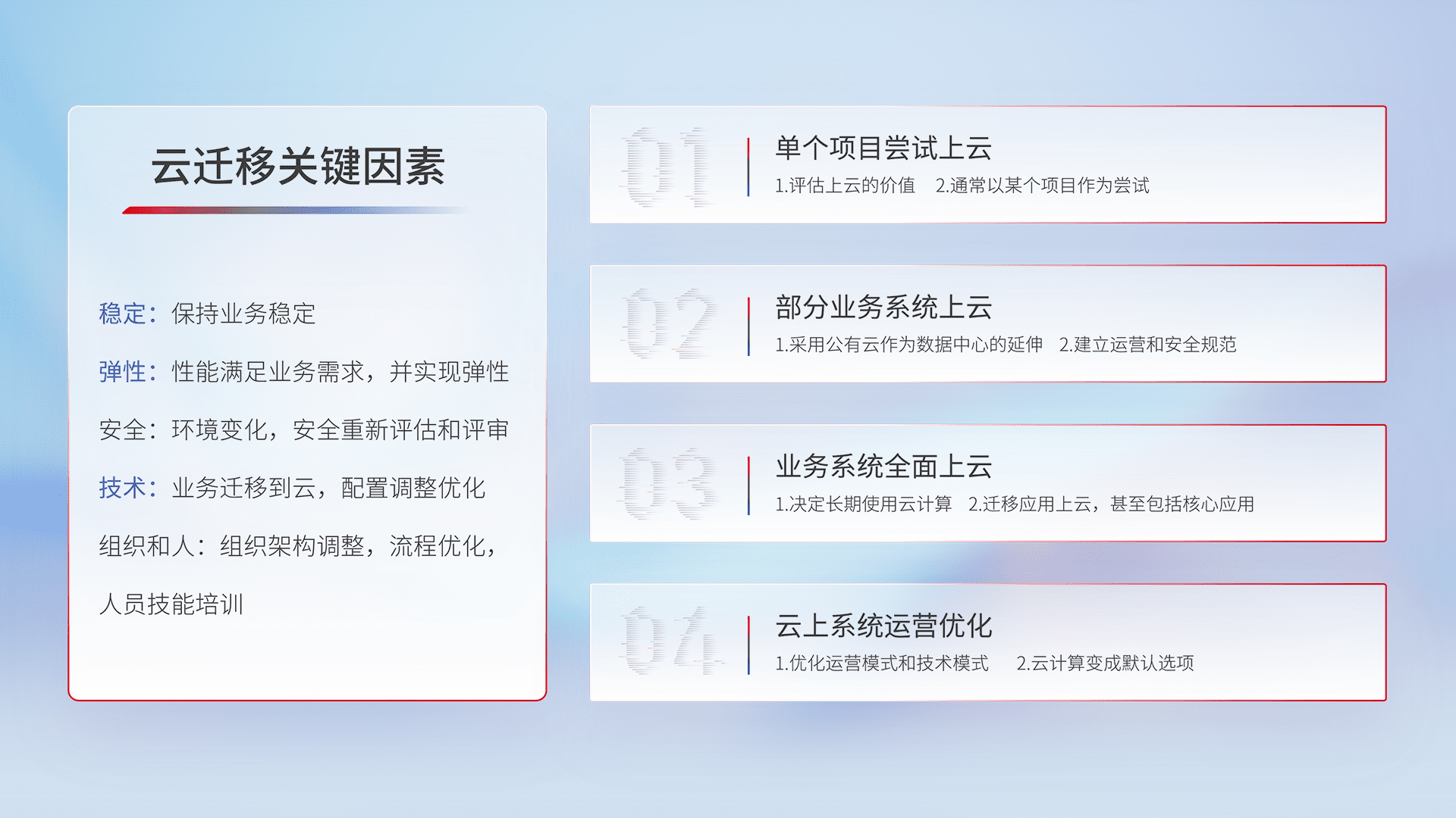 结合实际业务,,,从规划设计、、、云平台选型、、、、云原生改造、、、、数据迁移、、、集成交付,,迁移全过程为客户识别最佳上云路径,,做好风险识别管理,,,设计网络架构、、、身份权限、、、安全审计合规、、、操作审计、、、、日志审计、、、监控告警策略、、多站点容灾设计等,,,,对云上基础设施进行整体规划,,提升IT治理水平,,以满足弹性、、高可用、、高性能的需求。。。