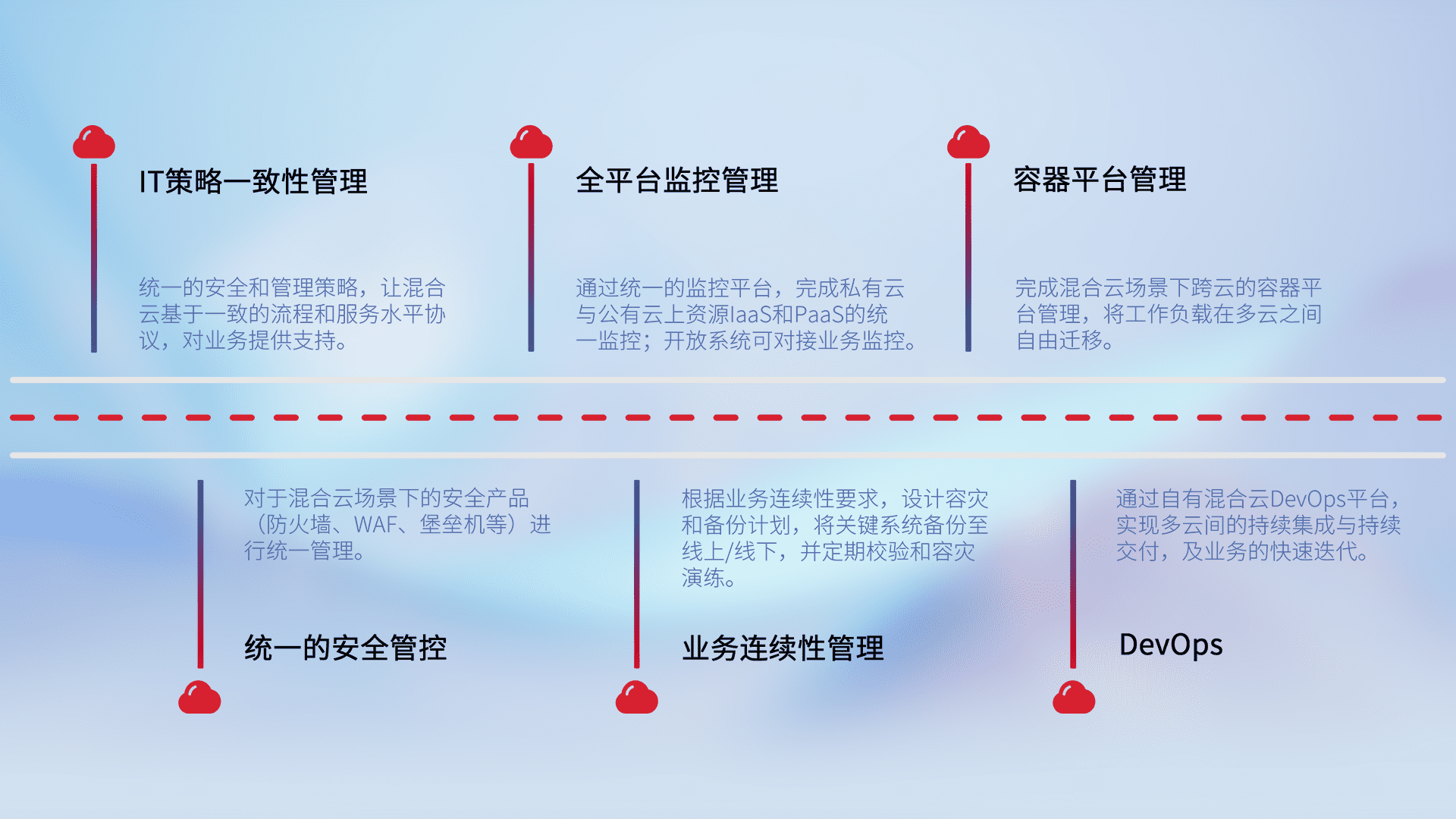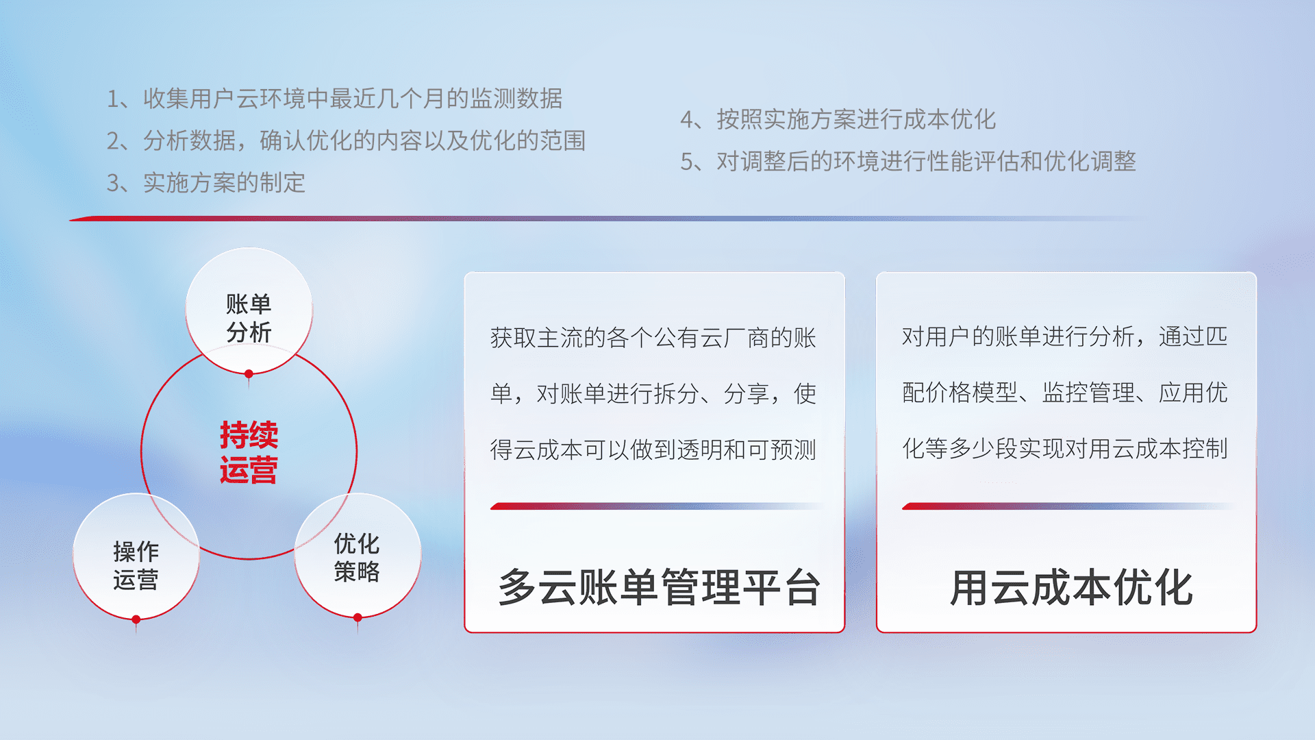 通过多云纳管,,,,以统一的资源数据模型把客户的云资源进行抽象和封装,,进而实现对多云资源的统一操作,,保障云资源管理的可靠性、、稳定性与可用性。。。。量身定制化运维内容,,,配置、、开发运维、、补丁管理、、、、备份、、、监控、、认证和访问管理、、、、审计和日常巡检等,,,保障在用云过程中的可靠度,,,稳定度以及高可用率。。。。